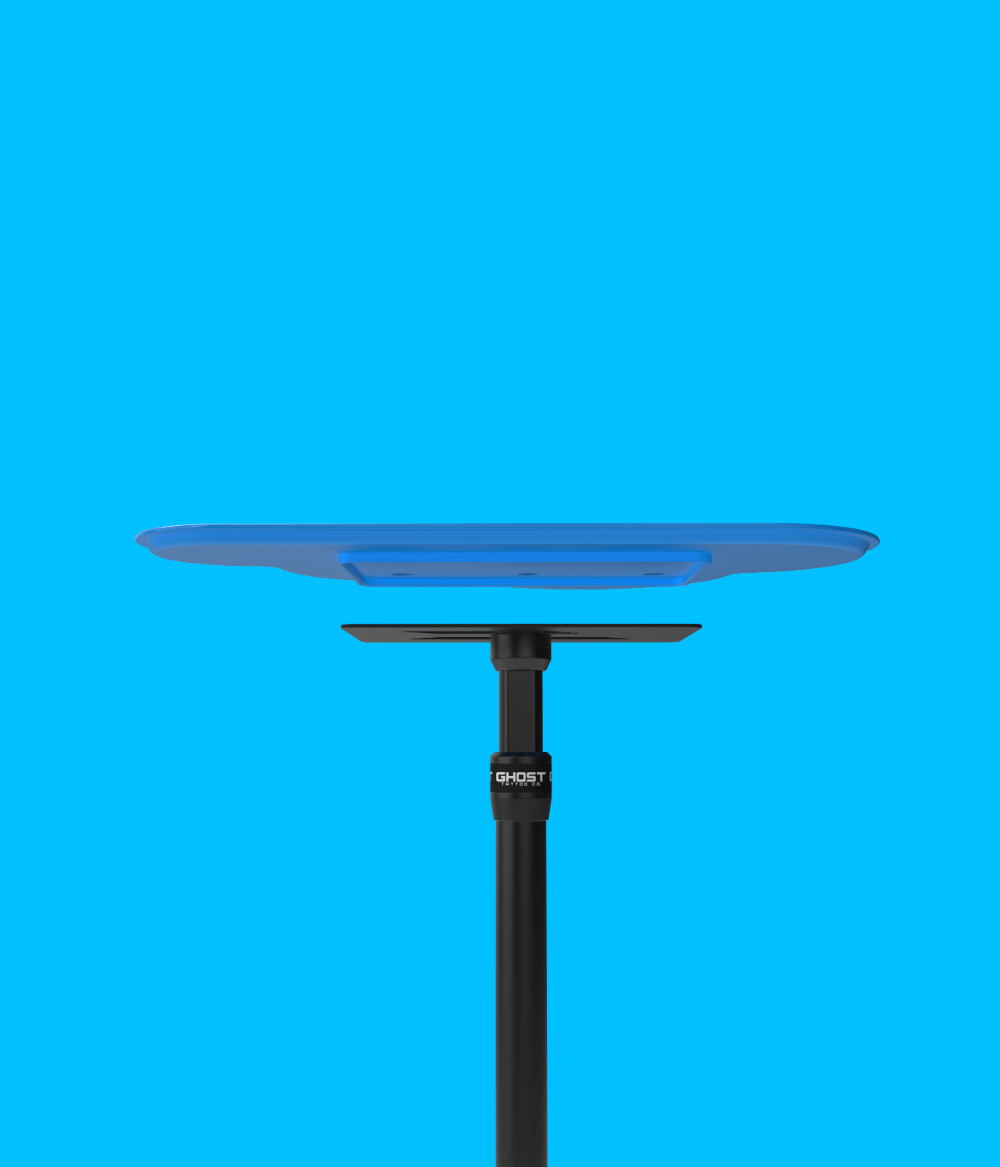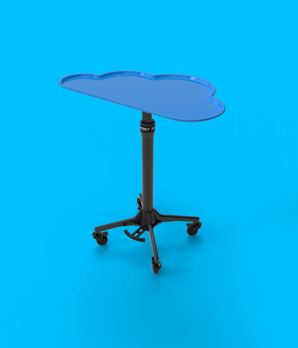 The Ghost Tray base offers an industry-first, foot lever actuation for hands-free height adjustment (24in - 36in) and a magnetic, removable, tray top 14.6in x 25.2in